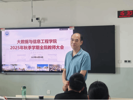 2025年8月20日16时30分,大数据与信息工程学院召开2025年秋季学期全院教师大会。会议由院长翟玉庆主持,党总支书记刘文晓作总结讲话,院内全体教职工参加会议。