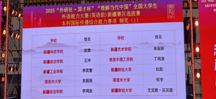 11月1日,2025“外研社·国才杯”“理解当代中国”全国大学生外语能力大赛新疆赛区选拔赛在石河子大学圆满落幕。大数据与信息工程学院计算机科学与技术专业学生李奕萱代表新疆工业学院参赛,凭借扎实的语言功底与出色的综合素养,在激烈角逐中脱颖而出,斩获佳绩。