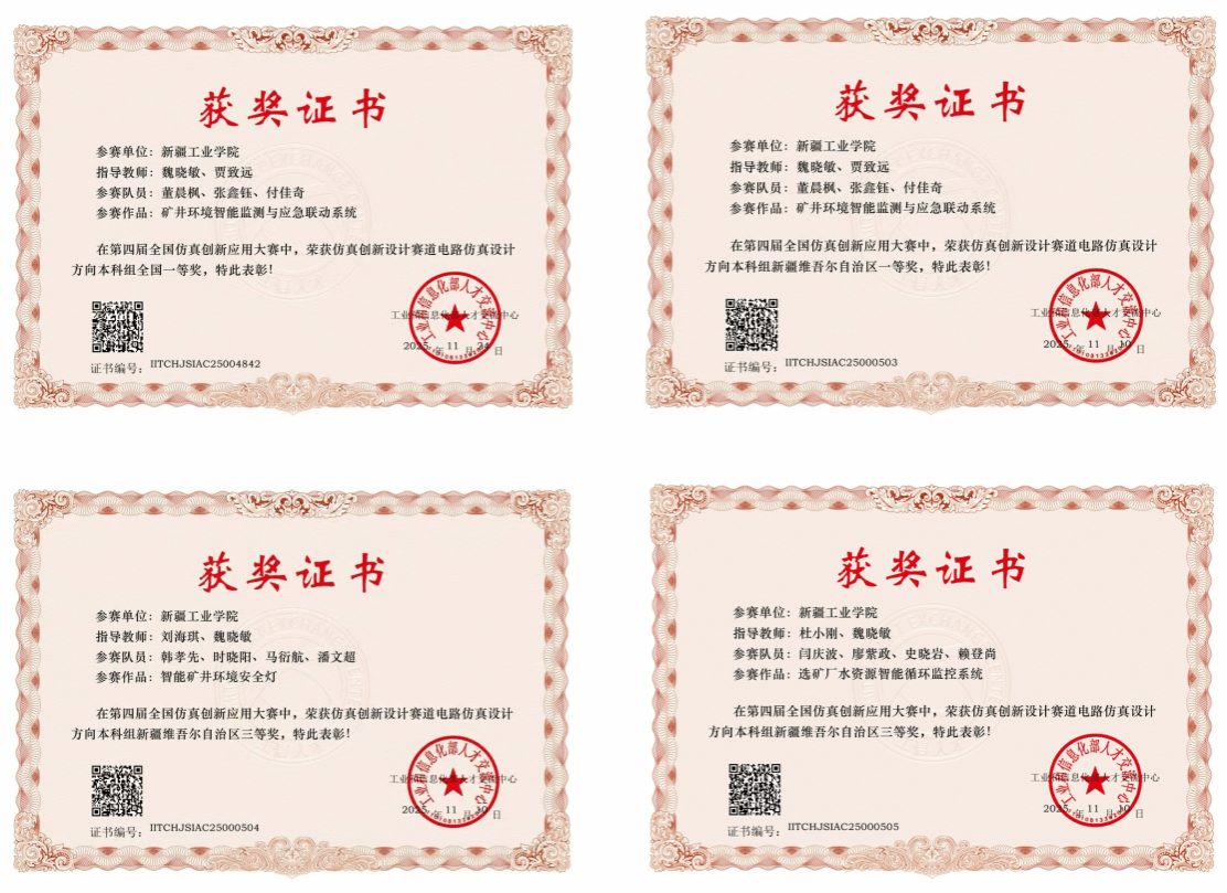 2025年全国仿真创新应用大赛(新疆赛区) | 智能矿井环境安全灯 | 韩孝先、时晓阳、马衍航、潘文超 | 刘海琪、魏晓敏 | 省级三等奖 |